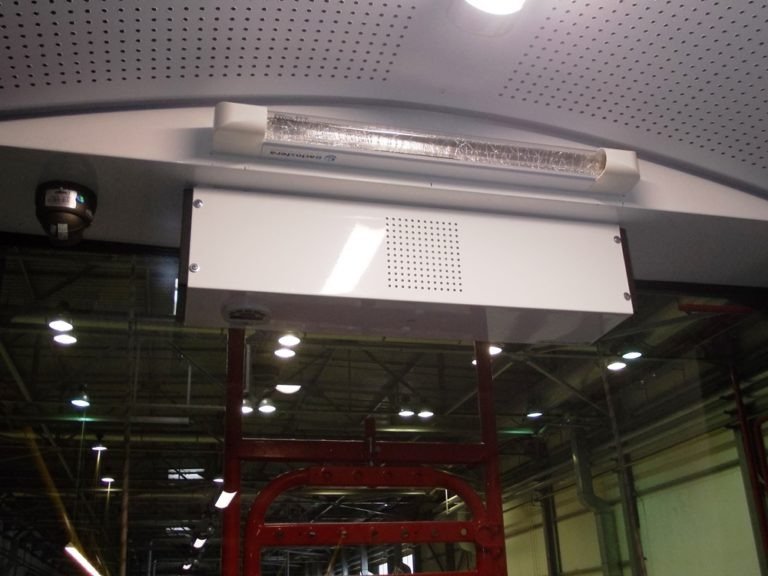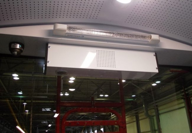 Опромінювач бактерицидний – це пристрій відкритого типу, який призначений для кварцування салону прямими ультрафіолетовими променями. Використання цього виду знезараження можливе лише за відсутності людей в салоні, наприклад на кінцевих зупинках. Застосування безозонових ламп не вимагає додаткових витрат часу на провітрювання салону після кварцування.