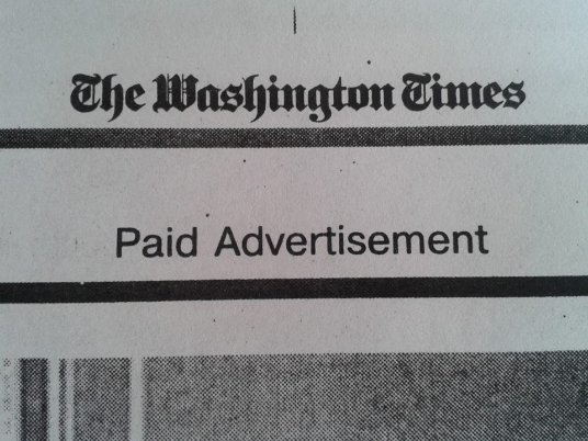 Стаття займає цілу шпальту з 8 фотографіями. Нагорі над статтею стоїть рубрика «Paid Advertisement» ‒ «оплачена реклама».