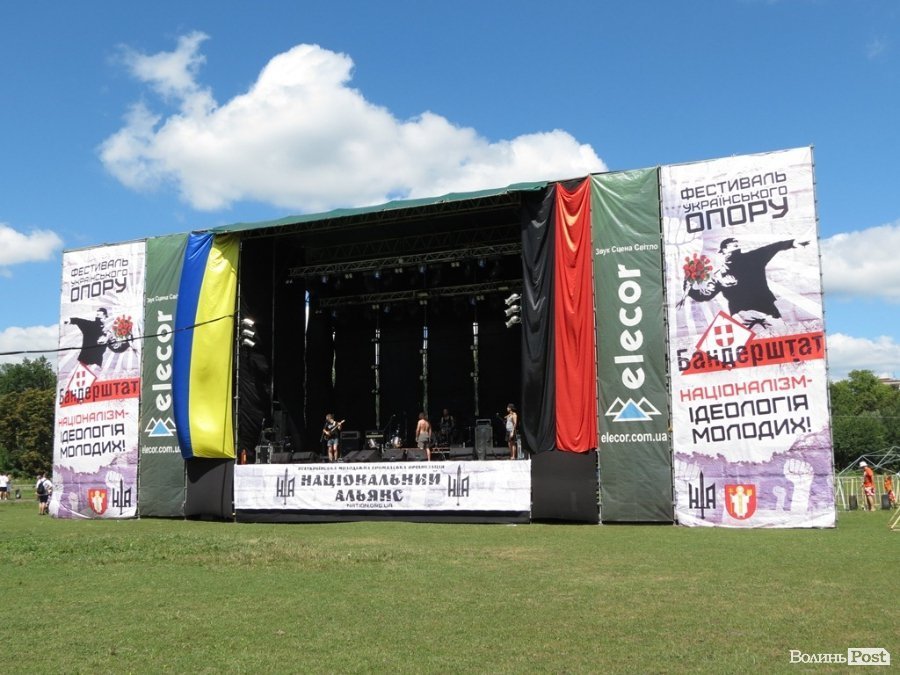 Так виглядає зараз сцена. На ній традиційно розміщені банери фестивалю, націоналістична символіка.
