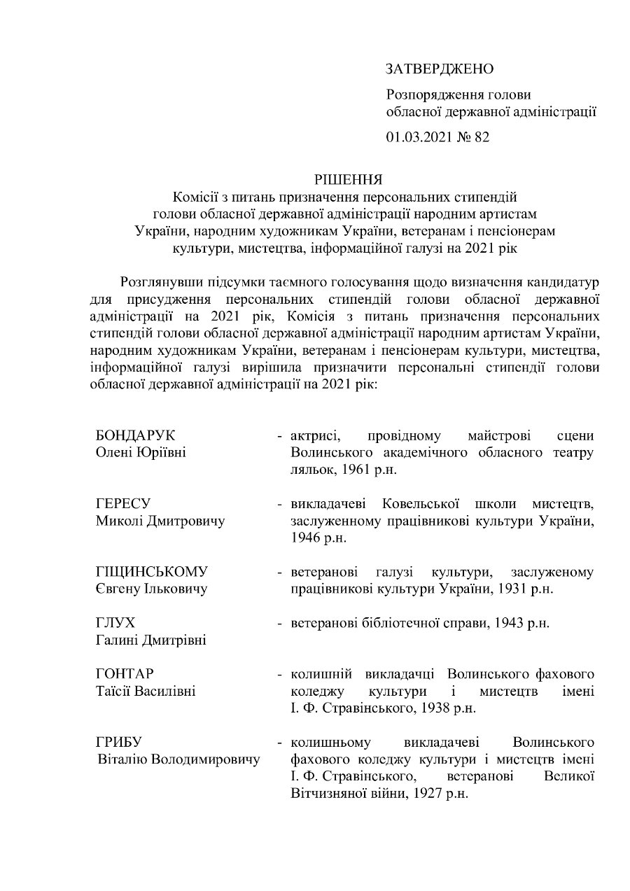 Розглянувши підсумки таємного голосування щодо визначення кандидатур для присудження персональних стипендій голови обласної державної адміністрації на 2021 рік, комісія вирішила призначити виплати 35 діячам культури і мистецтва. Вони отримуватимуть виплати у розмірі 500 гривень щомісяця впродовж року.