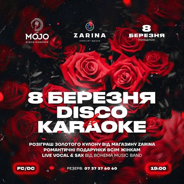 О 19 годині у MOJO Disco & Karaoke святкуватимуть 8 березня на вечірці під вокал гурту Bohema musik band. Відвідувачам обіцяють багато квітів, ігристого та розіграш золотого кулону ZARINA.