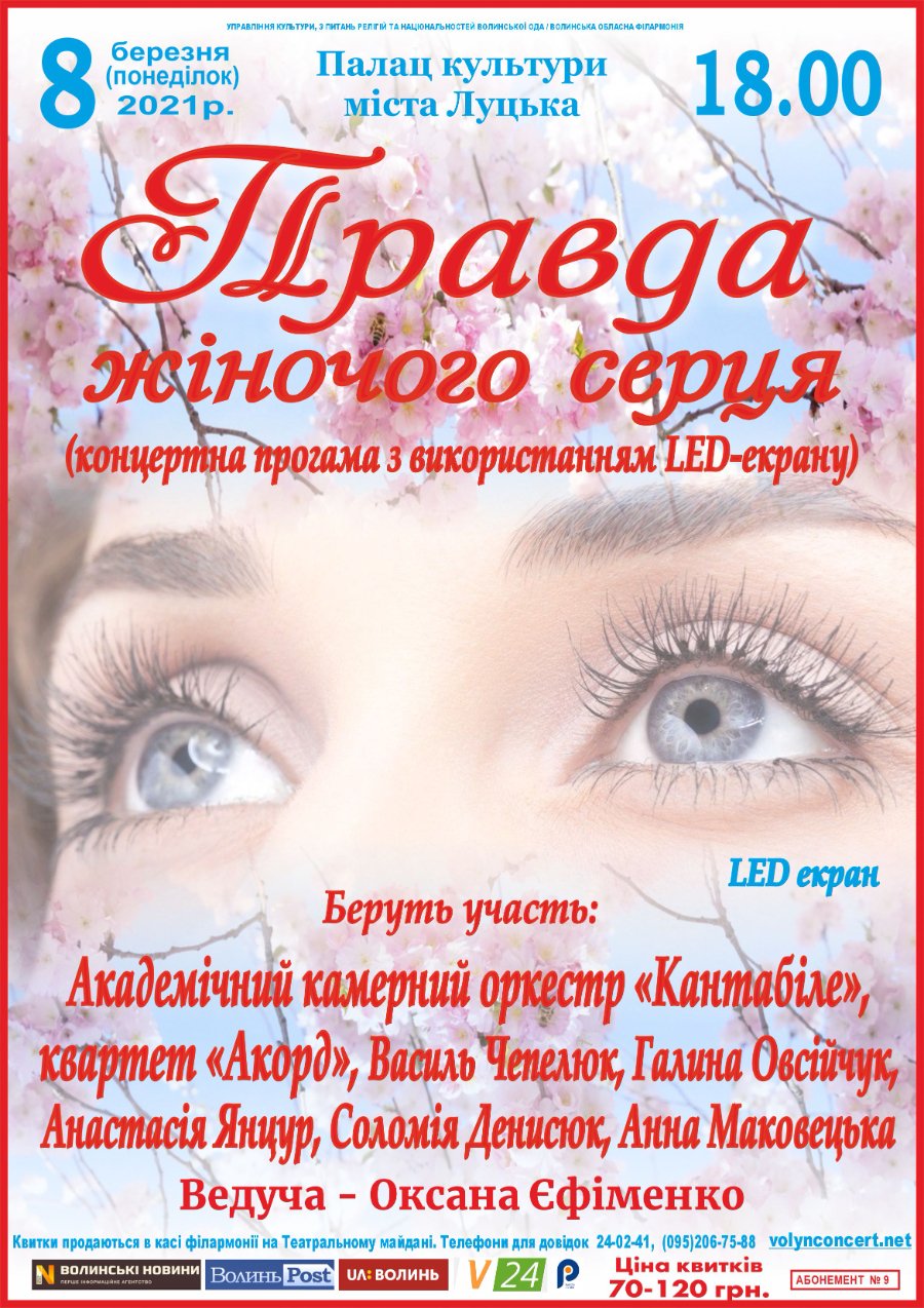 О 18 годині у Палаці культури міста відбудеться концерт під назвою «Правда жіночого серця». Вартість квитків: від 70 до 120 гривень.
