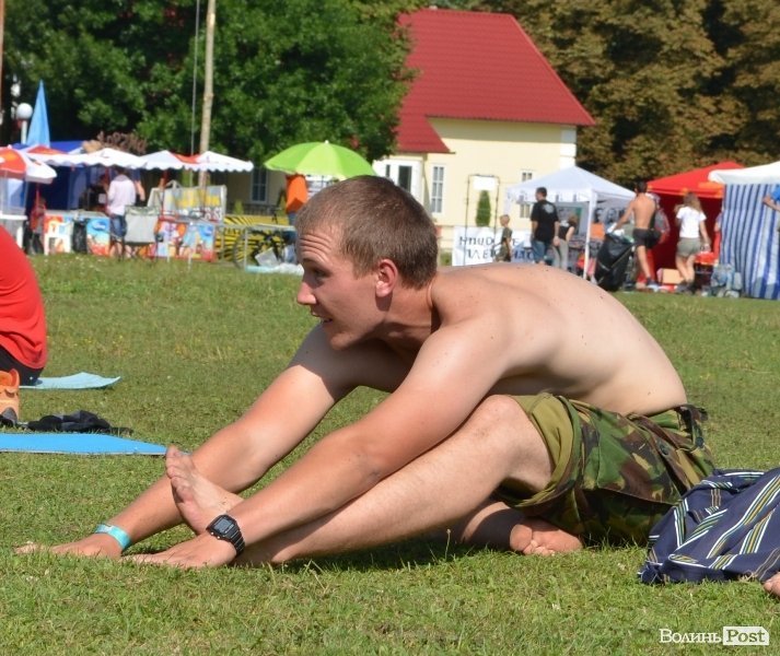 Розминали м’язи після вчорашніх танців учасники заняття навпроти сцени на траві. Інструктором заняття стала Христина Губська.