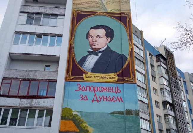 На стіні багатоповерхівки зобразили постать відомого українського співака-композитора Семена Гулака-Артемовського, на чию честь найменовано вулицю.
