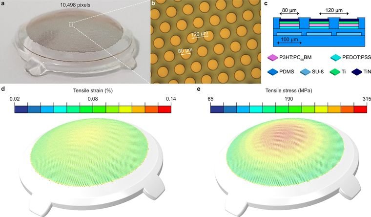 Імплантат, який розробили французькі науковці, може забезпечити поле зору у 46 градусів. Він бездротовий, виготовлений із високоеластичного та гнучкого матеріалу й містить фотоелектричні пікселі.