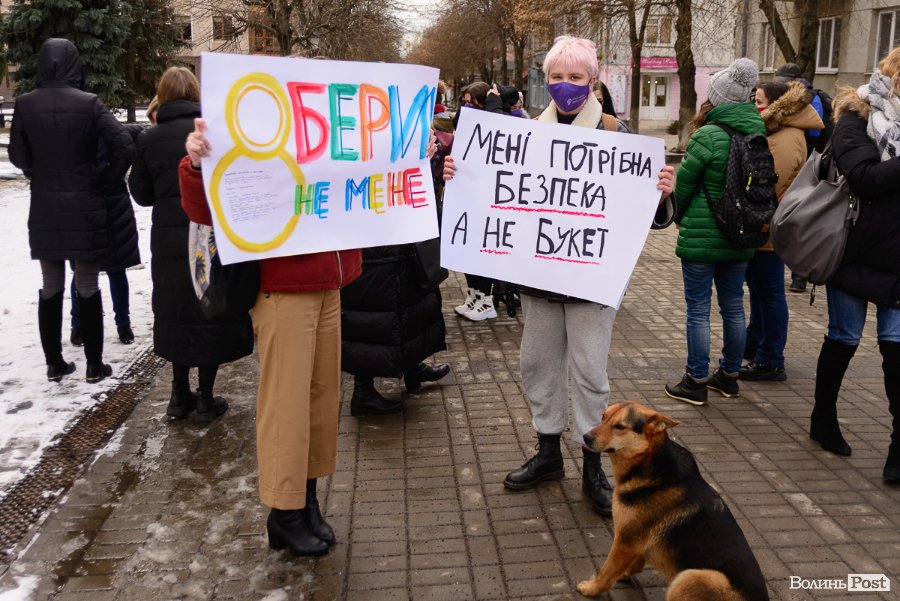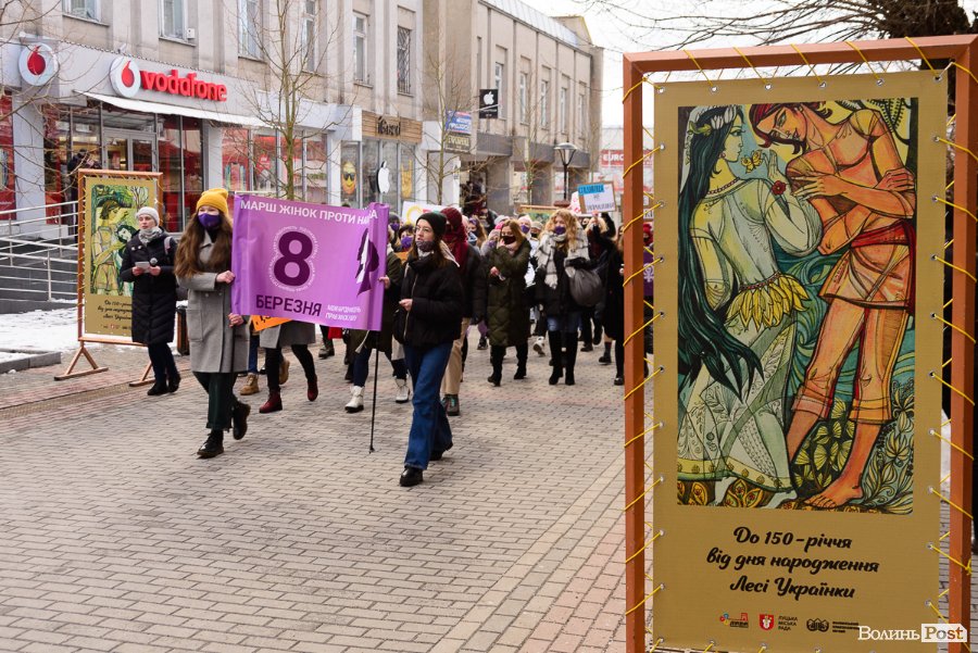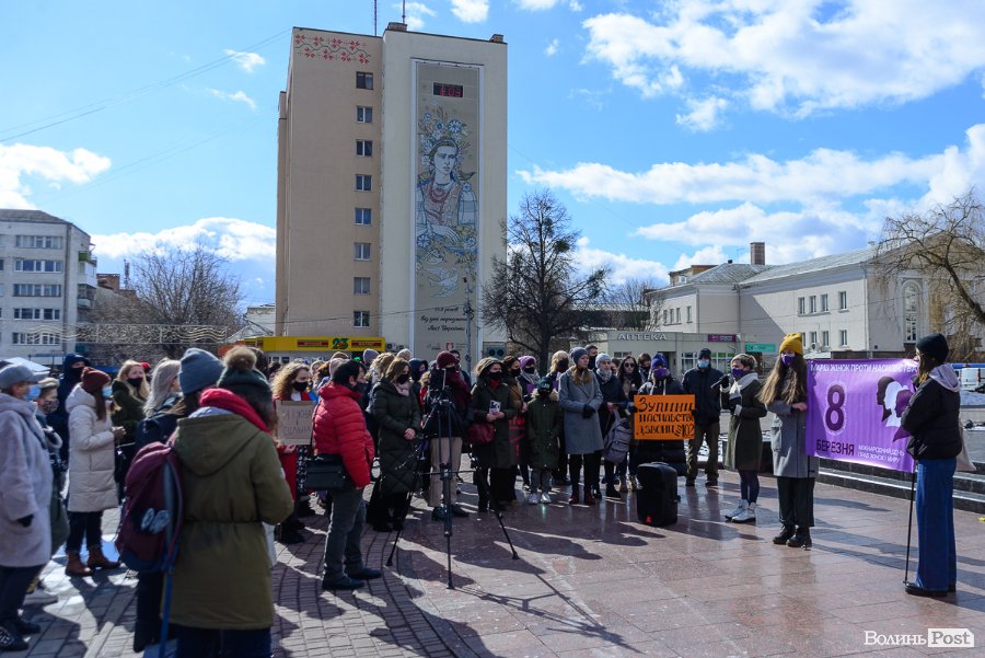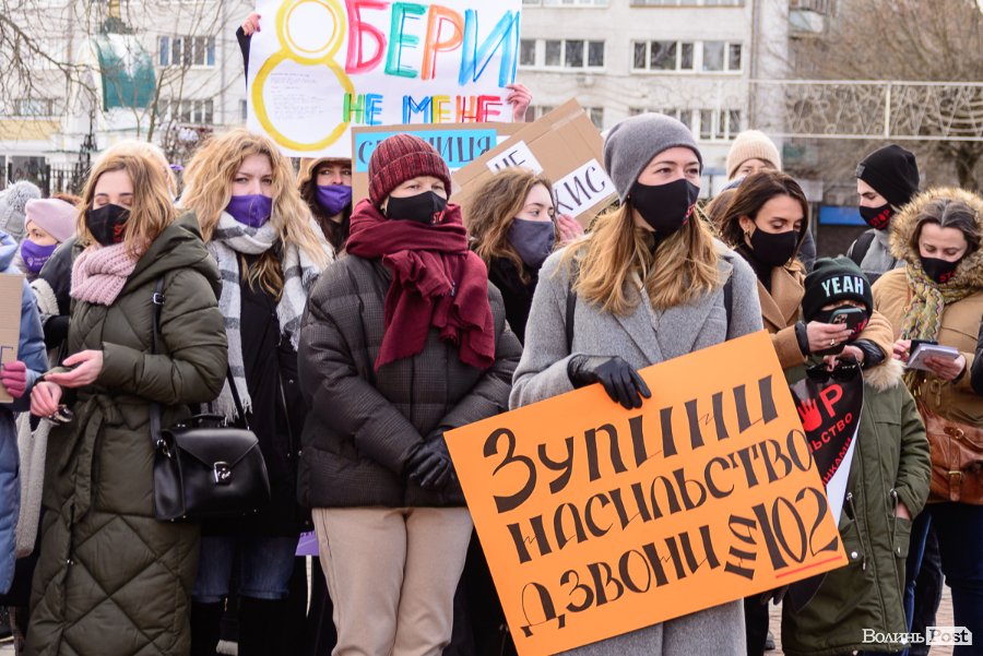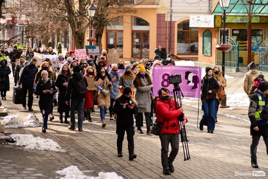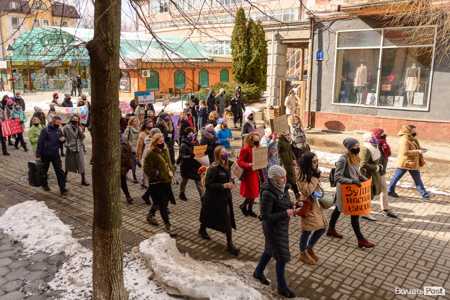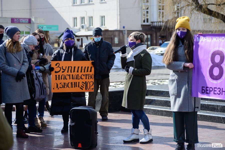 Близько 40 учасників Маршу жінок у Луцьку пройшли з плакатами з написами «Б'є – значить сяде! Не мовчи! Говори!», «Зупини насильство, дзвони на 102!», «Вимагаємо справедливих вироків!» від міського суду до пам'ятника Лесі Українці та до слідчого ізолятора. Активісти закликали правоохоронців справедливо карати домашніх тиранів.