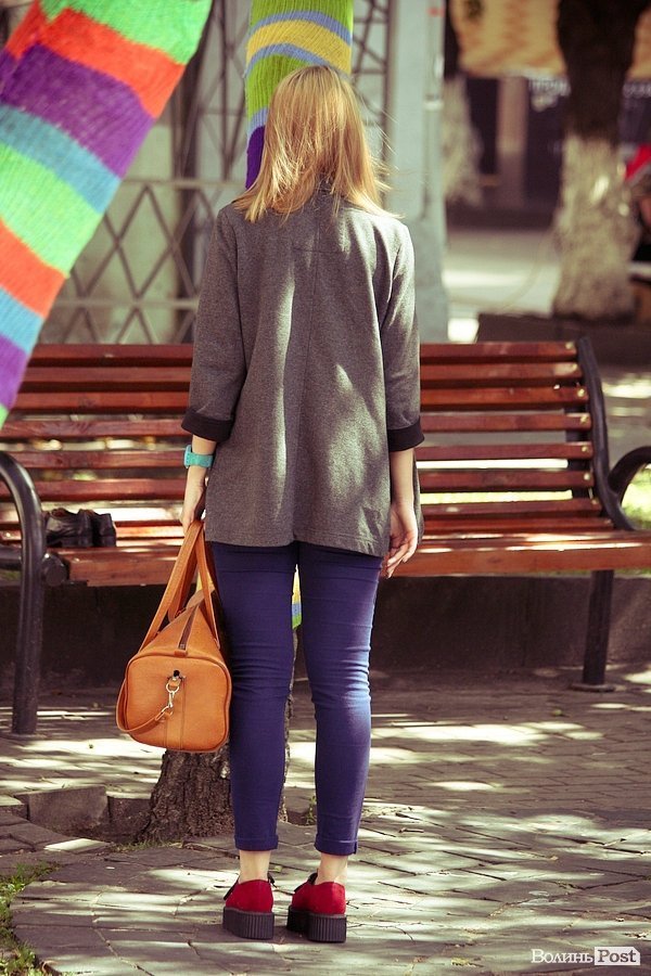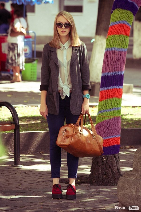 Загалом все це разом виглядає не зовсім гармонійно. Взуття не дуже пасує до цього вбрання, воно ніяк не підкріплене акцентами. Якби дівчина одягнула шорти, було б значно краще. Тоді і блузка колоритніше виглядала б зі спідницею або шортами. Анастасія підгорнула штани та рукави, тому складається враження, що вона все-таки стежить за модою. Довжина піджака суперечлива, вона просто візуально вкорочує їй ноги. У цьому випадку краще було б одягнути жилетку. Також немає гармонії і злагодженості в кольорах: сумка ‒ одного кольору, взуття ‒ іншого, а годинник і окуляри ще іншого. Думаю, що червона сумка могла б дещо врятувала ситуацію.
