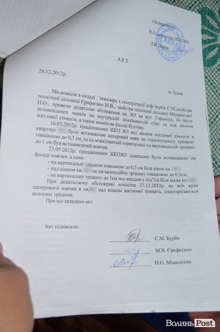 До того ж, як стверджує жінка, хоч будинок і не аварійний, утім, так звані маячки (спеціальні пластини, які кріпляться на тріщини стін, аби контролювати, чи вони не збільшуються) тут все ж встановили.