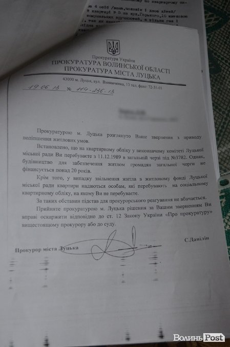 Порадою правоохоронців скористалася і написала в прокуратуру заяву-скаргу, де просила дати відповідь на деякі запитання і розібралися, чому після отримання службового житла родину Оксани зняли з черги на квартиру.