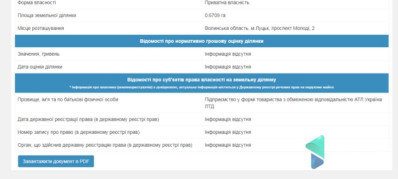 Згідно з публічною кадастровою картою, земельна ділянка під приміщенням площею 0,6709 га належить підприємству «АТЛ Україна» ЛТД. Кінцевим бенефіціарним власником ТзОВ «АТЛ Україна» ЛТД, за даними Уoucontrol наразі є Нежур Олег Олексійович. Як повідомляли ЗМІ, він же був і співзасновником ТРЦ «Гранд-Волинь».