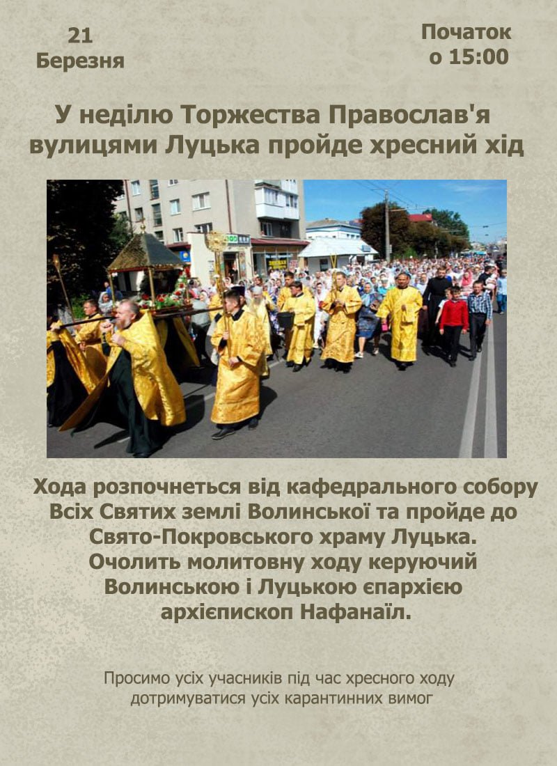 О 15 годині відбудеться хресний хід представників та вірян Волинської єпархії Української Православної Церкви (Московського патріархату). Хода розпочнеться від кафедрального собору Всіх Святих землі Волинської та пройде до Свято-Покровського храму Луцька. Очолить молитовну ходу керуючий Волинською і Луцькою єпархією архієпископ Нафанаїл.