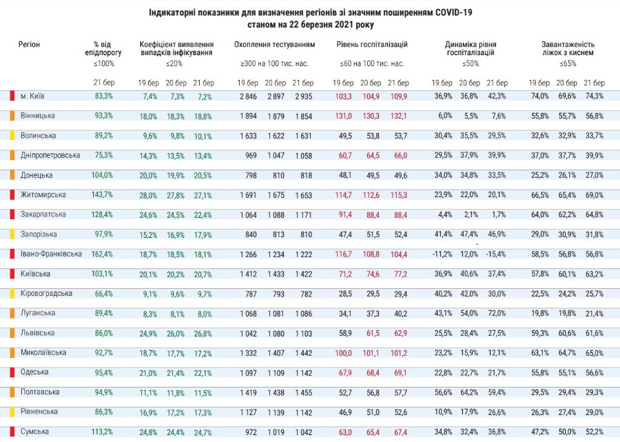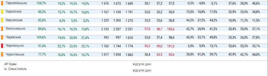 "Помаранчевими" залишаються Вінницька, Дніпропетровська, Донецька, Луганська, Львівська, Миколаївська, Полтавська, Тернопільська, Хмельницька, Черкаська і Чернігівська області.