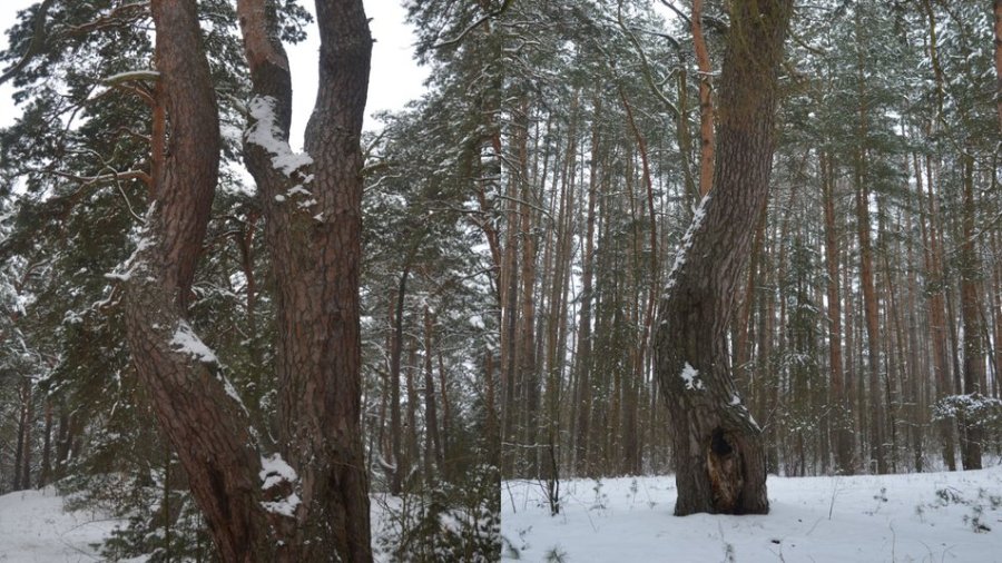 Лісівники кажуть, кривим деревам понад 100 років. Їх не вражають шкідники, хоч молоді сосни, висаджені навколо — пошкоджені.