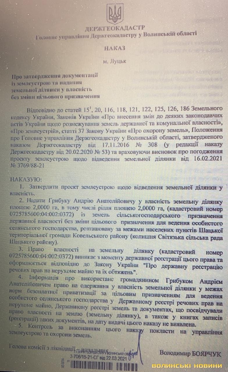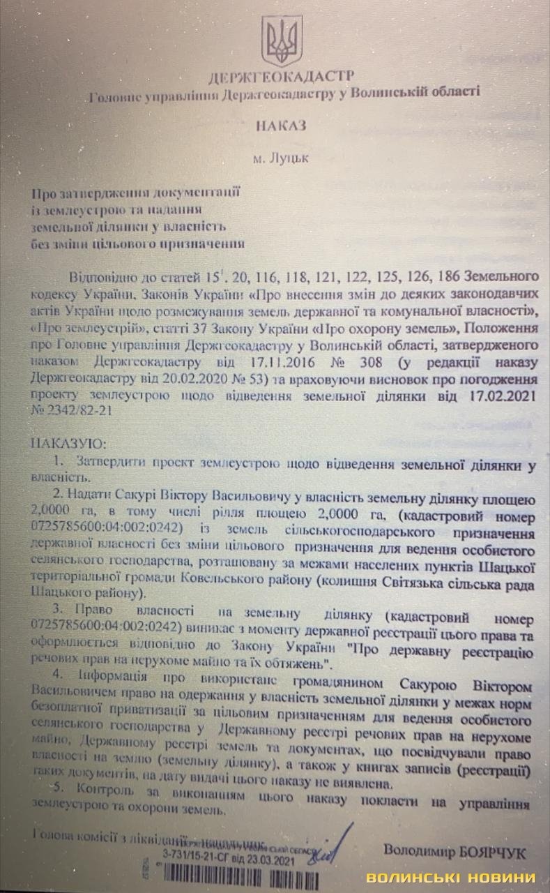 Зокрема, 23 березня 2021 року керівник Головного управління Держгеокадастру у Волинській області Володимир Боярчук підписав три накази про передачу у приватну власність 6 гектарів земель з покладами будівельного піску. Йдеться про ділянки з кадастровими номерами 0725785600:04:002:0371, 0725785600:04:002:0242 та 0725785600:04:002:0372 на території Світязької сільради Шацької територіальної громади.