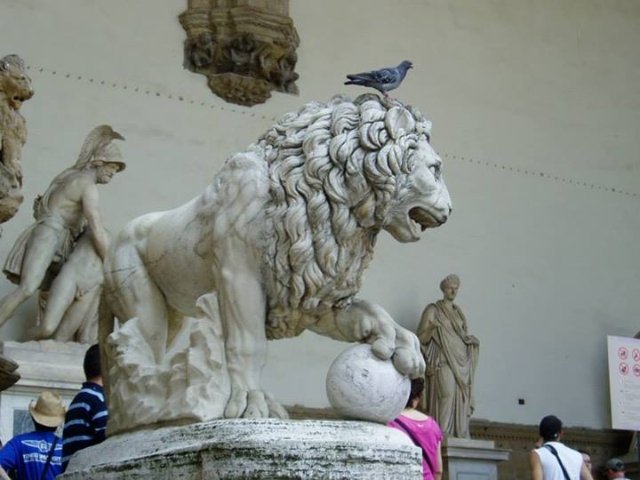 Флоренція, 2008 рік. Біля міської ратуші на плацу зібрано скульптурні шедеври різних відомих митців, у тому числі Мікеланджело. Але сподобався оцей могутній лев, на голові якого мирно сидів простий голуб. Алегорія життя. Автор Ольга Харів