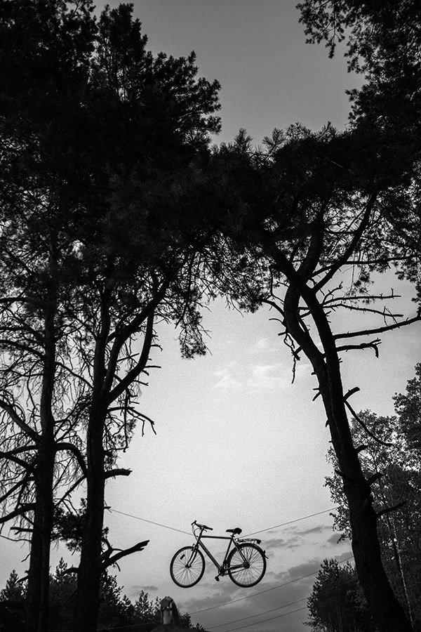 Особливості української парковки. Чого велосипед висить на канаті, поміж високих сосен, як шишка? Щоб не поцупили?... 30 червня 2013 р. Гряда, озеро Світязь. Автор Костянтин Семицький