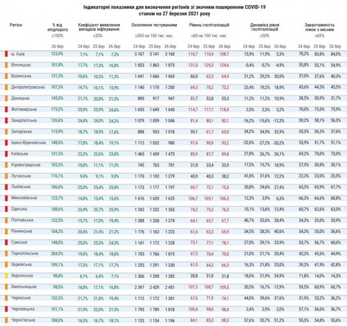 Міністерство охорони здоров'я вдруге за сьогодні оновило показники для визначення регіонів зі значним поширенням COVID-19 – тепер до «червоних» віднесено 10 регіонів, а не 13, як було зранку.