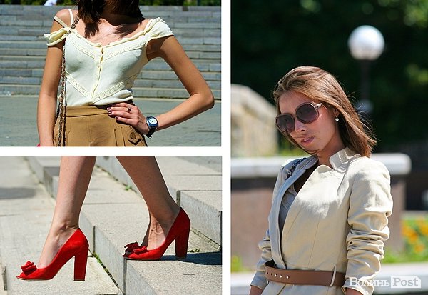 Щоправда, не завжди слід підбирати взуття до сумки, але у нашому випадку саме це освіжає і надає образу живості. Також можна було б взяти з собою сумку темно-коричневого кольору, вона підкреслювала б колір її волосся, окуляри і пасок годинника. У неї модно призібраний рукав, хоча мода на це триває вже три останні роки. Дуже вдала довжина спідниці та підборів. У цьому дуже зручно ходити і на роботу, і на навчання. Дівчина одягнена зі смаком, очевидно, що вона попіклувалась про те, щоб правильно все підібрати.