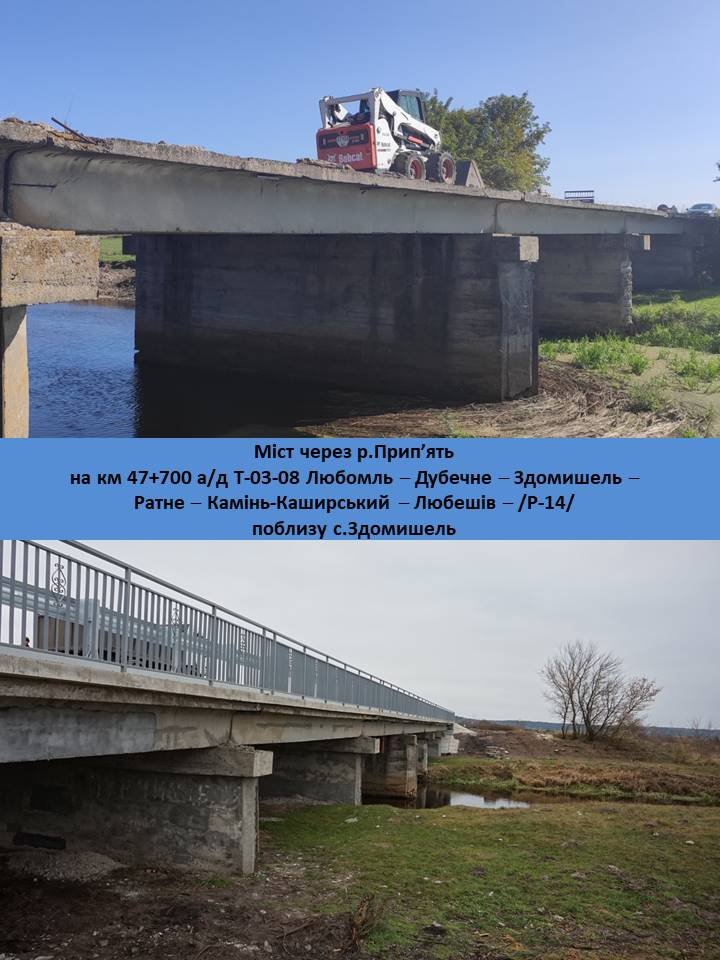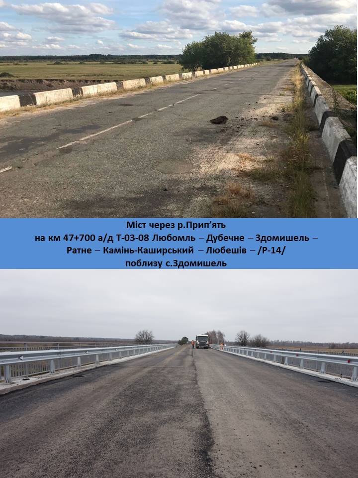 Упродовж жовтня-грудня минулого року на замовлення Служби автомобільних доріг у Волинській області провели комплекс робіт з відновлення цієї штучної споруди, завдовжки понад 68 метрів. Зокрема, укріпили відкоси мосту, замінили гідроізоляцію, встановили нове бар’єрне та перильне огородження, відновили дорожнє покриття тощо. На ремонтні роботи цього мосту спрямували майже 3,2 млн. грн державних коштів.