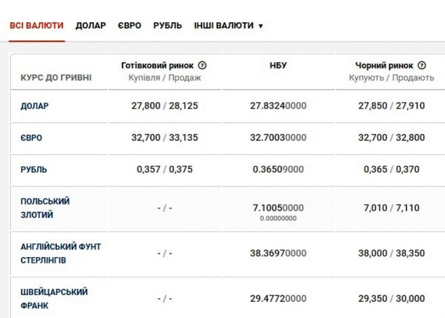 Долар купівля -27.80, продаж - 27.90