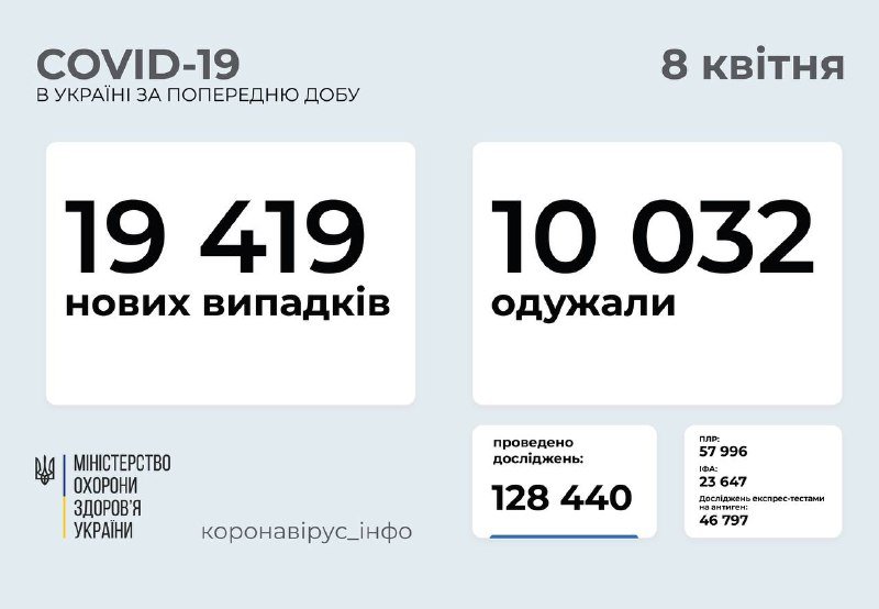 19 419 нових випадків коронавірусної хвороби COVID-19 зафіксували в Україні станом на 8 квітня.