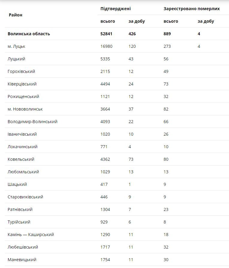 Головний державний санітарний лікар області інформує, що за останню добу на Волині зареєстрували 426 нових підтверджених випадків коронавірусної хвороби COVID-19 (з них дітей – 18, медпрацівників — 11).