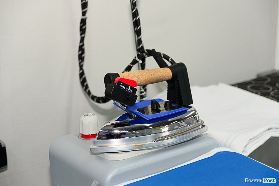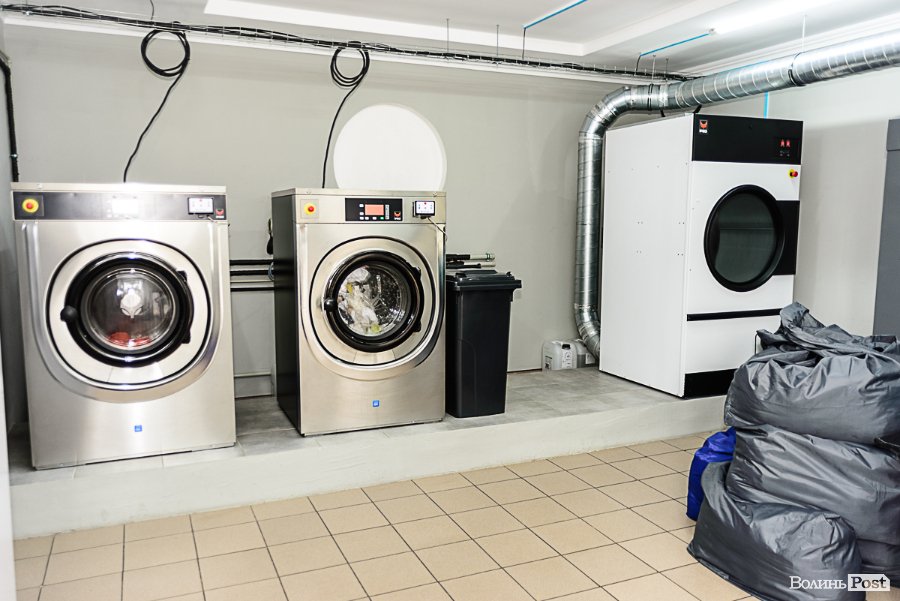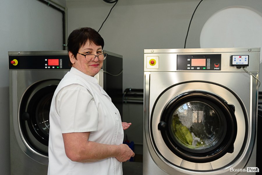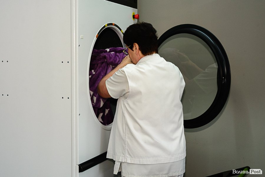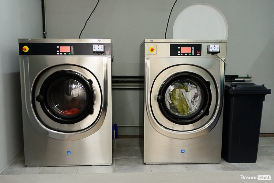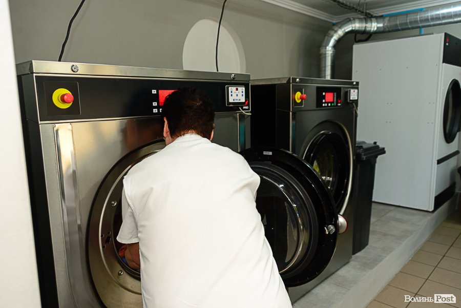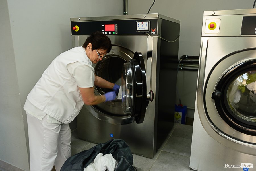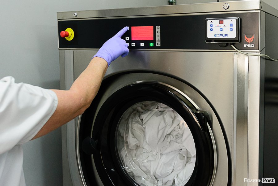 На один цикл прання витрачають 170 літрів води. Машинка пере, дезінфікує, потім знову пере та полоще. Після цього речі сушать.