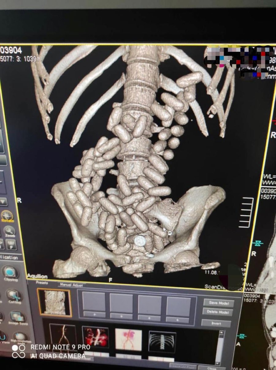 Під час проведення комп’ютерної томографії виявилося, що в його черевній порожнині знаходиться 91 овальна капсула з невідомою речовиною.