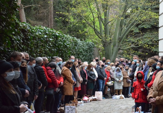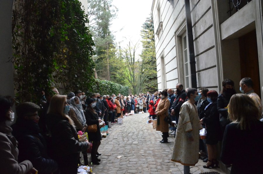 Попри коронавірусні обмеження, сотні українців прийшли в неділю вранці до церкви Успіння Пресвятої Богородиці Української греко-католицької церкви у Варшаві, щоб посвятити великодні страви.