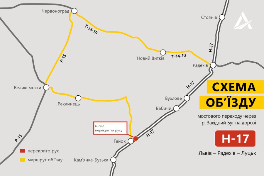Наразі вже організували об'їзд за схемою (напрямок зі Львова). Доїжджаєте до міста Кам'янко-Бузька, там здійснюєте поворот ліворуч і їдете у напрямку міста Великі мости. Далі дорогою Р-15 до міста Червоноград, а звідти дорогою Т-14-10 до міста Радехів. У зворотному напрямку діє аналогічна схема руху.