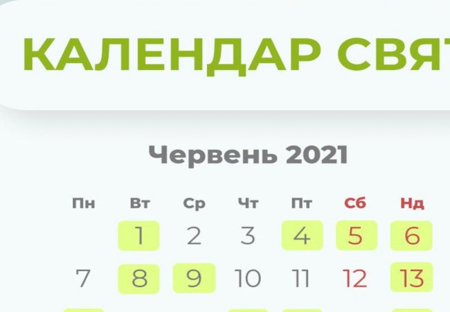 У червні 2021 року всього буде десять офіційних вихідних. Святкування православного перехідного свята Дня Святої Трійці випадає на неділю, 20 червня, у зв’язку з чим понеділок, 21 червня, згідно зі статтею 73 Кодексу законів про працю України, також буде неробочим.