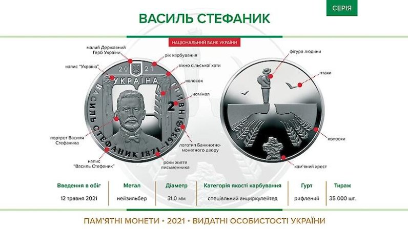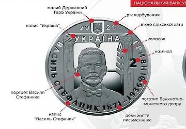 Так, монету із серії "Видатні особистості України", яку присвятили 150-річчю від дня народження українського письменника-новатора, поета, громадського діяча і політика Василя Стефаника, пустять в обіг з 12 травня.