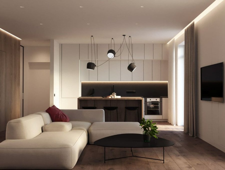 Зона вітальні не відділена від зони кухні перестінками. Це робить помешкання більш просторим