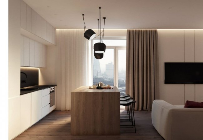 Ці зони не розділяли перестінками чи перегородками, а лише - окремими елементами інтер’єру. За рахунок цього, а також завдяки світлим кольорам це допомогло візуально збільшити простір.
