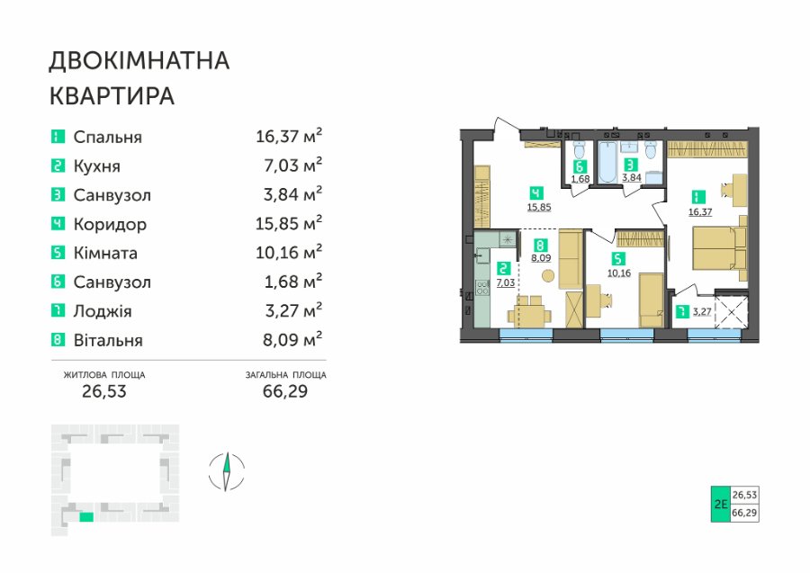Серед головних переваг квартири 66,29 м2 - великий передпокій (15,85 м2), два санвузли, дві спальні (10,16 та 16,37 м2), кухня і вітальня, які можна об’єднати (7,03 та 8,09 м2) та лоджія (3,27 м2).