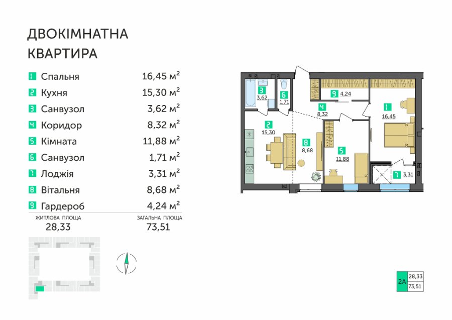 Особливістю квартири 73,51 м2 є великий гардероб (4,24 м2), роздільний санвузол, можливість облаштувати простору кухню-студію (24 м2), дві спальні (11,88 та 16,45 м2), а також лоджія (3,31 м2).