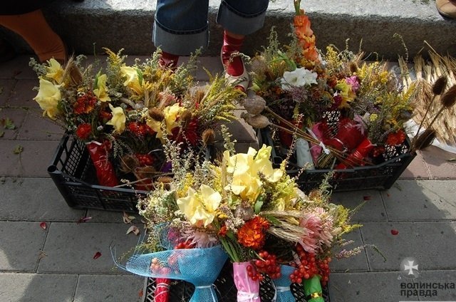 На Театральному майдані Луцька зібралося багато торгівців букетами квітів, зіллям та, звичайно, маком.