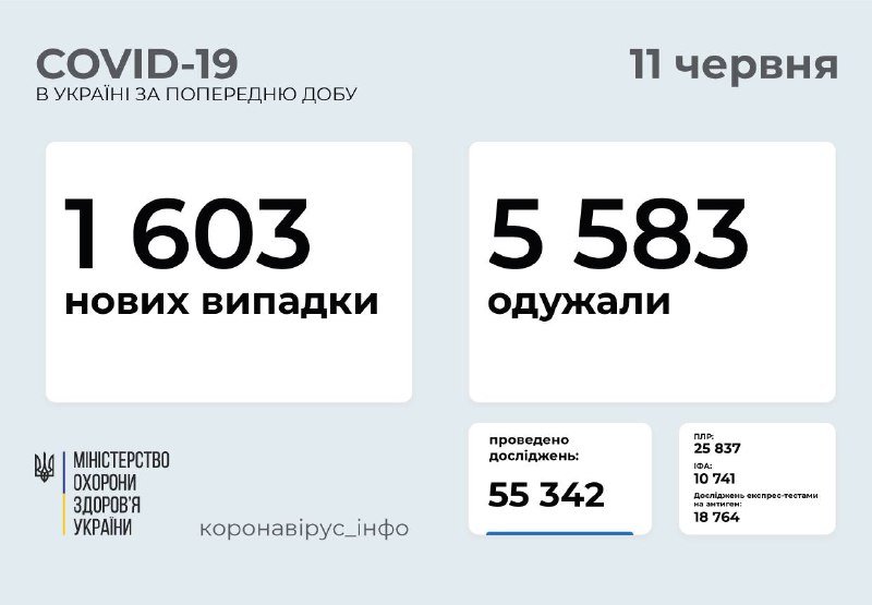 1 603 нових випадки коронавірусної хвороби COVID-19 зафіксували в Україні станом на 11 червня 2021 року. Зокрема, захворіли 75 дітей та 72 медпрацівники.