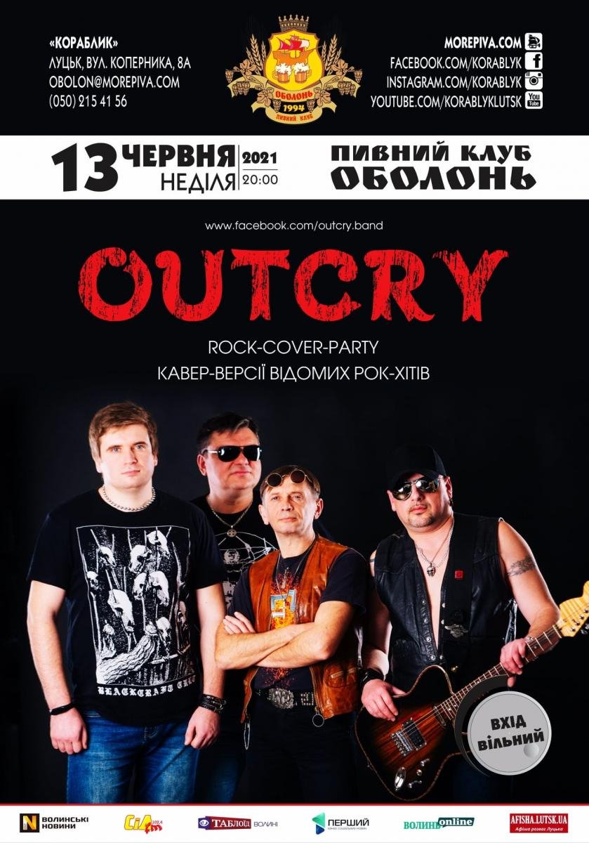 «Гурт OUTCRY добре відомий у рок-тусовці міста Луцька, адже має більше, ніж 20-літню історію. Команда переживала багато змін у складі, експериментувала з форматами виступів, вдосконалювала репертуар. Проте незмінний рок-стрижень банди залишався завжди. Ось і на цей раз ауткраївці заграють вам купу крутих каверів на відомі рок-хіти. Гори драйву, море пива та крутий професійний рівень музикантів – ось чого варто очікувати в неділю у Кораблику», - запрошують організатори.