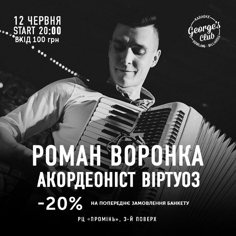 О 20 годині у ресторані-караоке George's Club (РЦ «Промінь») запрошують на виступ Романа Воронки. Вхід коштує 100 гривень.