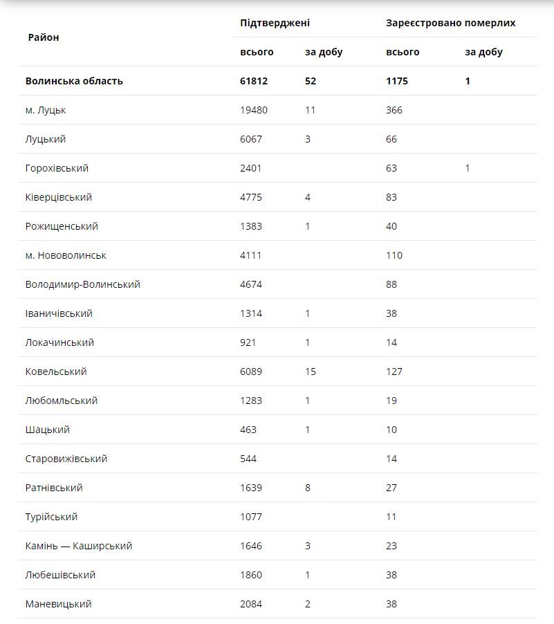 За останню добу на Волині зареєстрували 52 нових підтверджених випадки коронавірусної хвороби COVID-19 (з них дітей – 1, медпрацівників – 2).