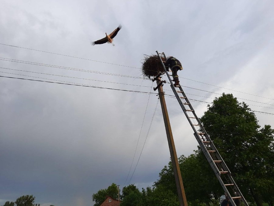 У селі Усичі Луцького району бійці ДСНС повернули в гніздо лелеченя, яке з нього випало.