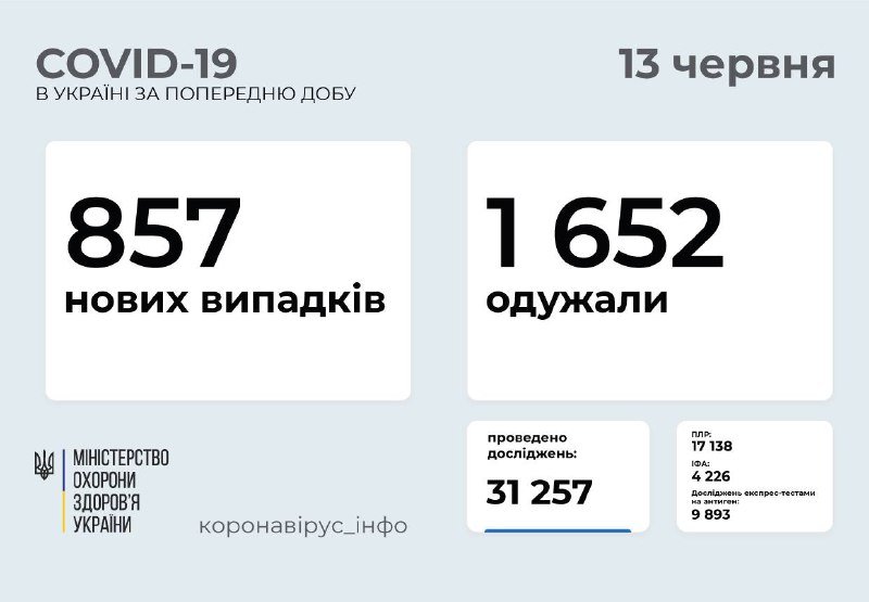 857 нових випадків коронавірусної хвороби COVID-19 зафіксували в Україні станом на 13 червня 2021 року. Зокрема, захворіли 37 дітей та 17 медпрацівників.