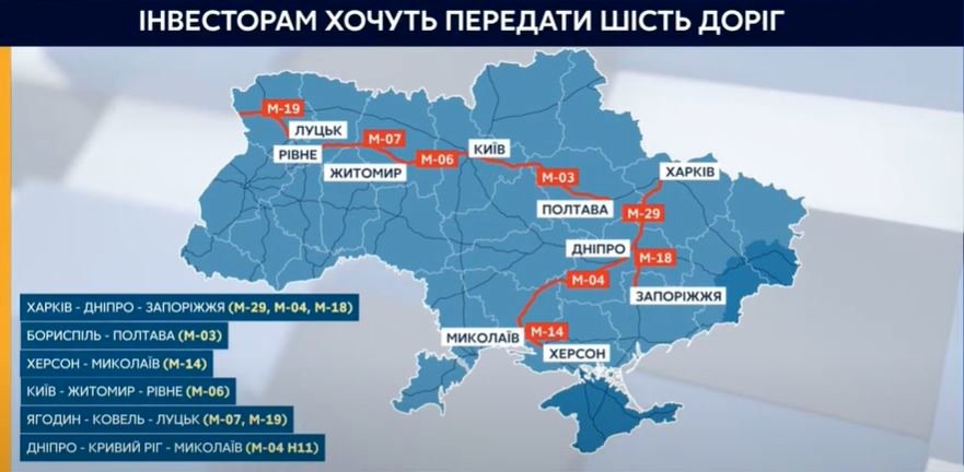 У мінінфраструктурі вже навіть визначилися з першими 6 трасами, які планують віддати інвестору. Це Харків-Дніпро-Запоріжжя, траса з Борисполя до Полтави, Херсон-Миколаїв. Зі столиці можна буде доїхати до Рівного через Житомир, Ягодин-Ковель-Луцьк і Дніпро-Кривий Ріг-Миколаїв.