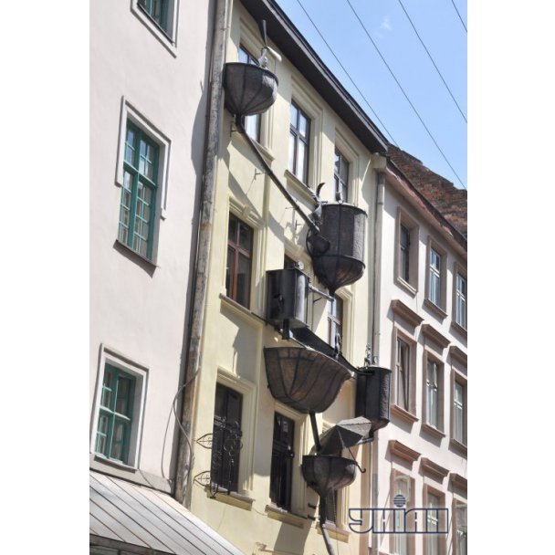 Фасад будівлі прикрашають різнокольорові а також суворі сірі речі, схожі на старовинні котли.
