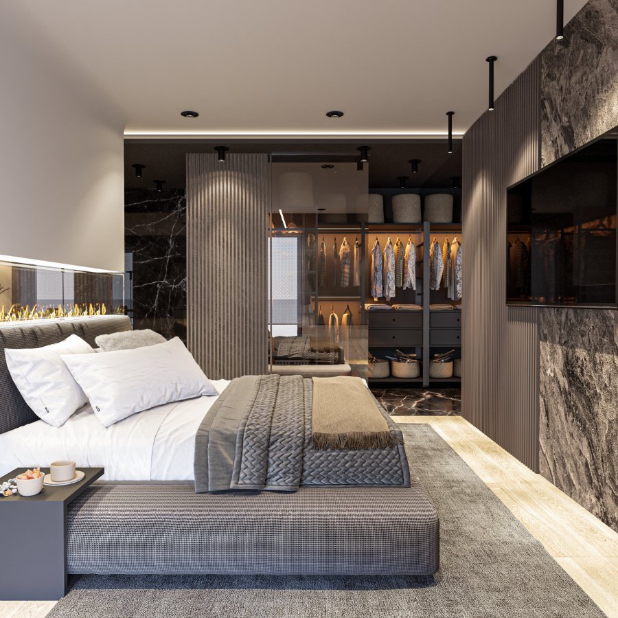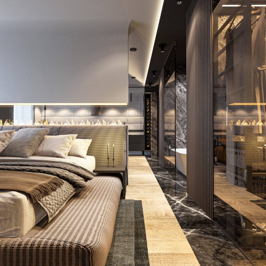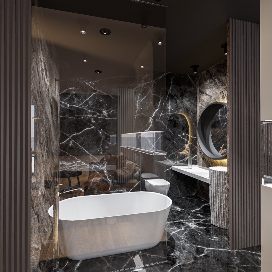 Ванна кімната відокремлена від кімнати скляною перегородкою. І це - ще одне оригінальне та сміливе рішення в оформленні інтер’єру. Передбачене використання так званого смарт-скла. Таке “розумне” скло перемиканням пульта стає тонованим, непрозорим.