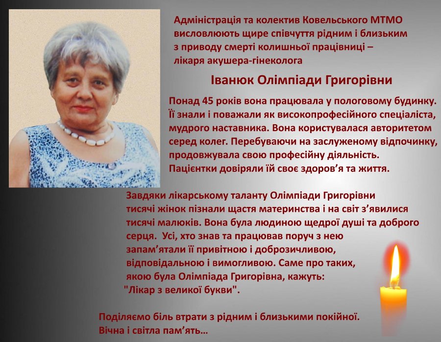 На Волині померла лікар акушер-гінеколог Іванюк Олімпіада Григорівна.