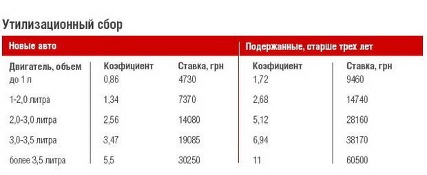 Нагадаємо, що утилізаційний збір вираховується з базової ставки (5500 грн.) Плюс коефіцієнт в залежності від об'єму двигуна: