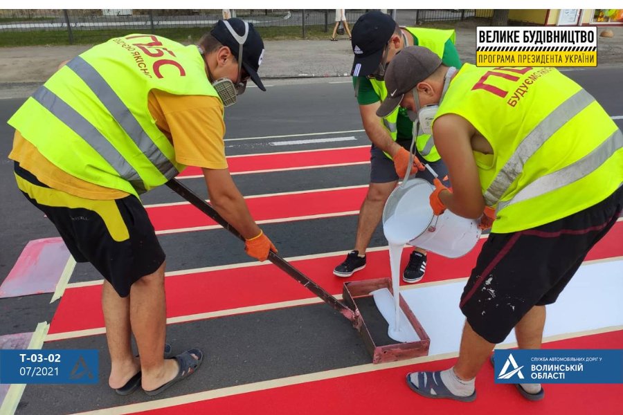 Від села Піща до села Положеве маємо понад 26 кілометрів нового асфальтного покриття зі свіжою дорожньою розміткою. Аби шлях був комфортним і безпечним не лише для водіїв, а й для пішоходів, на відновленій ділянці Т-03-02 дорожники наносять розмітку на пішохідних переходах.