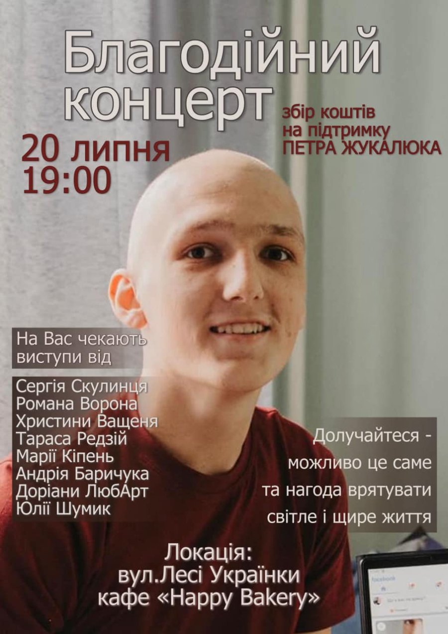 Відтак, аби допомогти спортсмену подолати хворобу, в місті організовують благодійний концерт. Під час заходу виступлять: Сергій Скулинець, Роман Ворон, Христина Ващеня, Тарас Редзій, Марія Кіпень, Андрій Баричук, Доріана ЛюбАрт, Юлія Шумик.